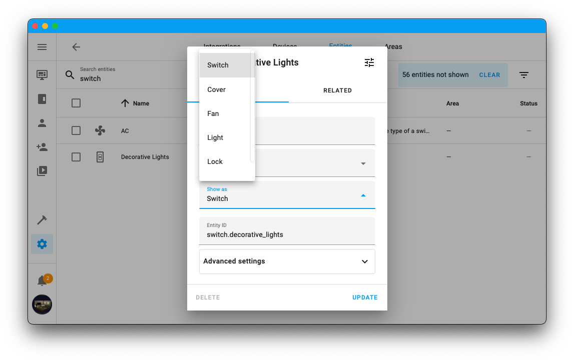 For example, you can turn any Home Assistant switch into a Home Assistant Light, Cover, Fan, Lock, or Siren. This will replace it with the updated domain and hide the switch. This is great for those hard-wired light switches and allows you to add them to light groups!