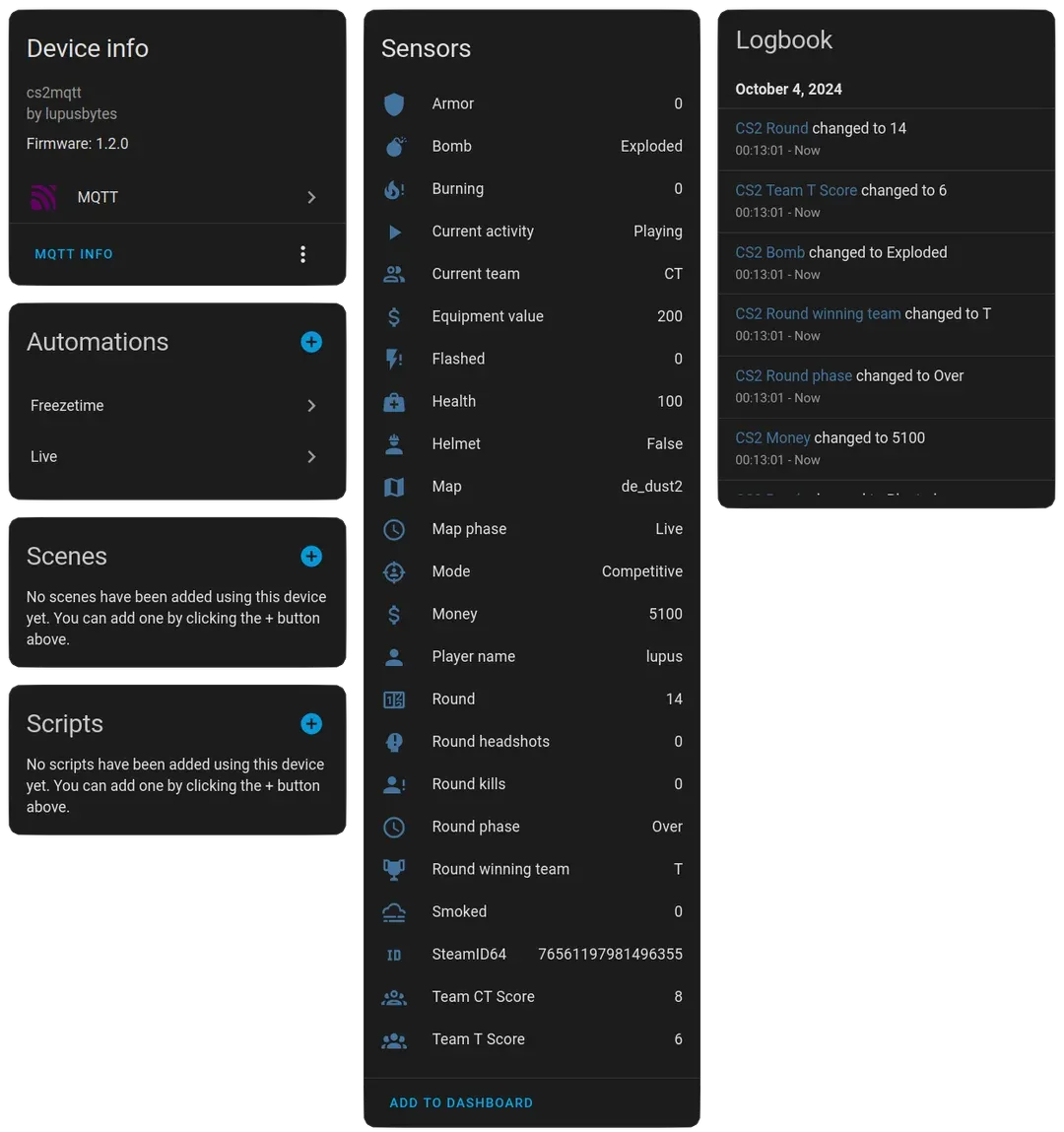 Automate your lights to go wild when you defuse the bomb, or when it goes off. A previous community project made this possible, but was deprecated, so LupusOnFire took on the task of bringing this back and we now have cs2mqtt.