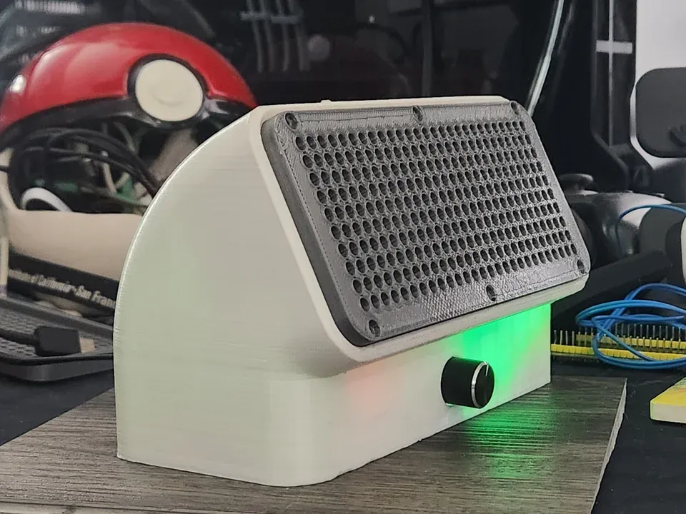 r/ekognaG has made a 3D-printed voice speaker for music and voice assist via ESPHome. It has an S3 inside, along with two pretty big speakers, a volume knob, and mics. I think a little speaker fabric would complete the look 😉.