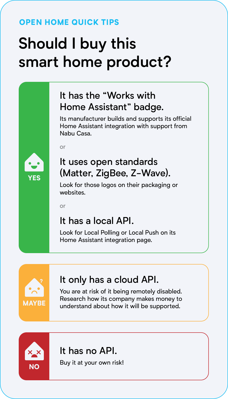 So, before you order that shiny new thing for Christmas, check out its Home Assistant integrations page. The sidebar on the right will show you the IoT class of the integration for that device. If it says Local Polling or Local Push, Home Assistant can communicate with it locally, and you're good. If it says Cloud Polling or Cloud Push, you must ask yourself how much you trust this company. Will it still be around in three years, five, or ten? Are they owned by investors who may prioritize profit over customers? What is their business model like?