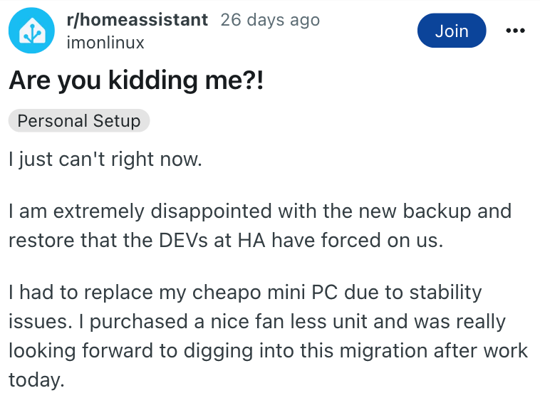 u/imonlinux was disappointed that the restore of their Home Assistant backup went incredibly smoothly, which led to their plans of a full weekend of troubleshooting being spoiled. The team sincerely apologizes for the disruption to your tinkering.