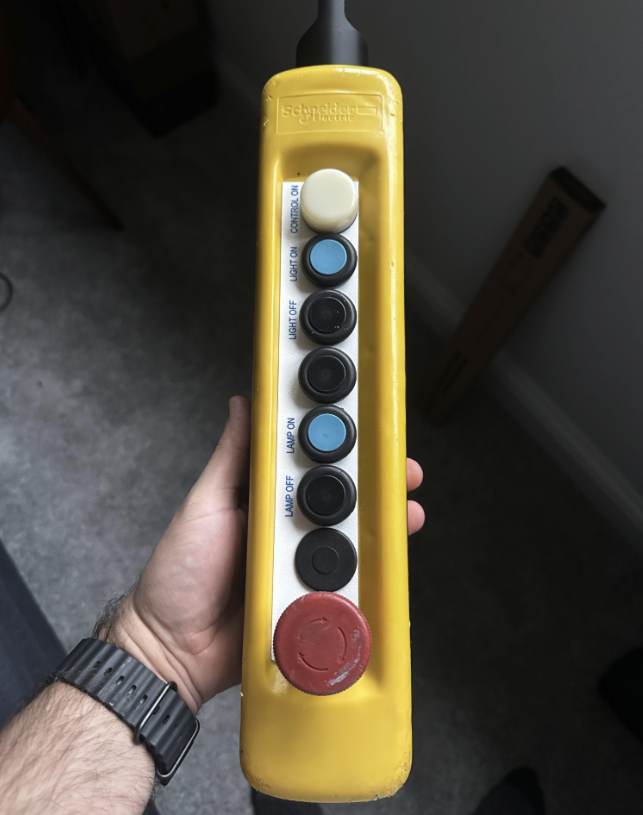 Space-age touchscreens are all very slick, but if you miss something chunkier, u/Confident-Substance transformed an old crane pendant into a Zigbee smart home controller, complete with big red emergency stop that, uh, turns off a light.